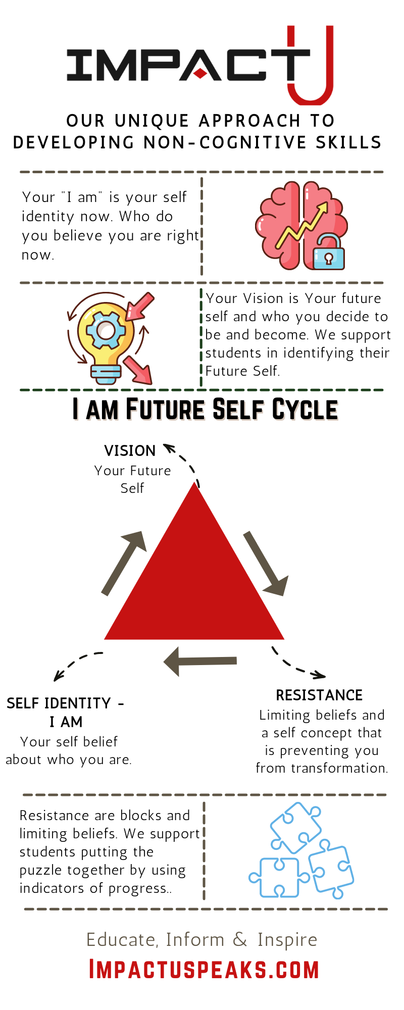 Impact U's philosophy is to educate, inform and inspire you. Students learn the skills to transform their lives to step into their future selves. We focus on self actualization and our students becoming their future selves by focusing on developing self confidence, relational intelligence, self discipline and management and decision making skills.